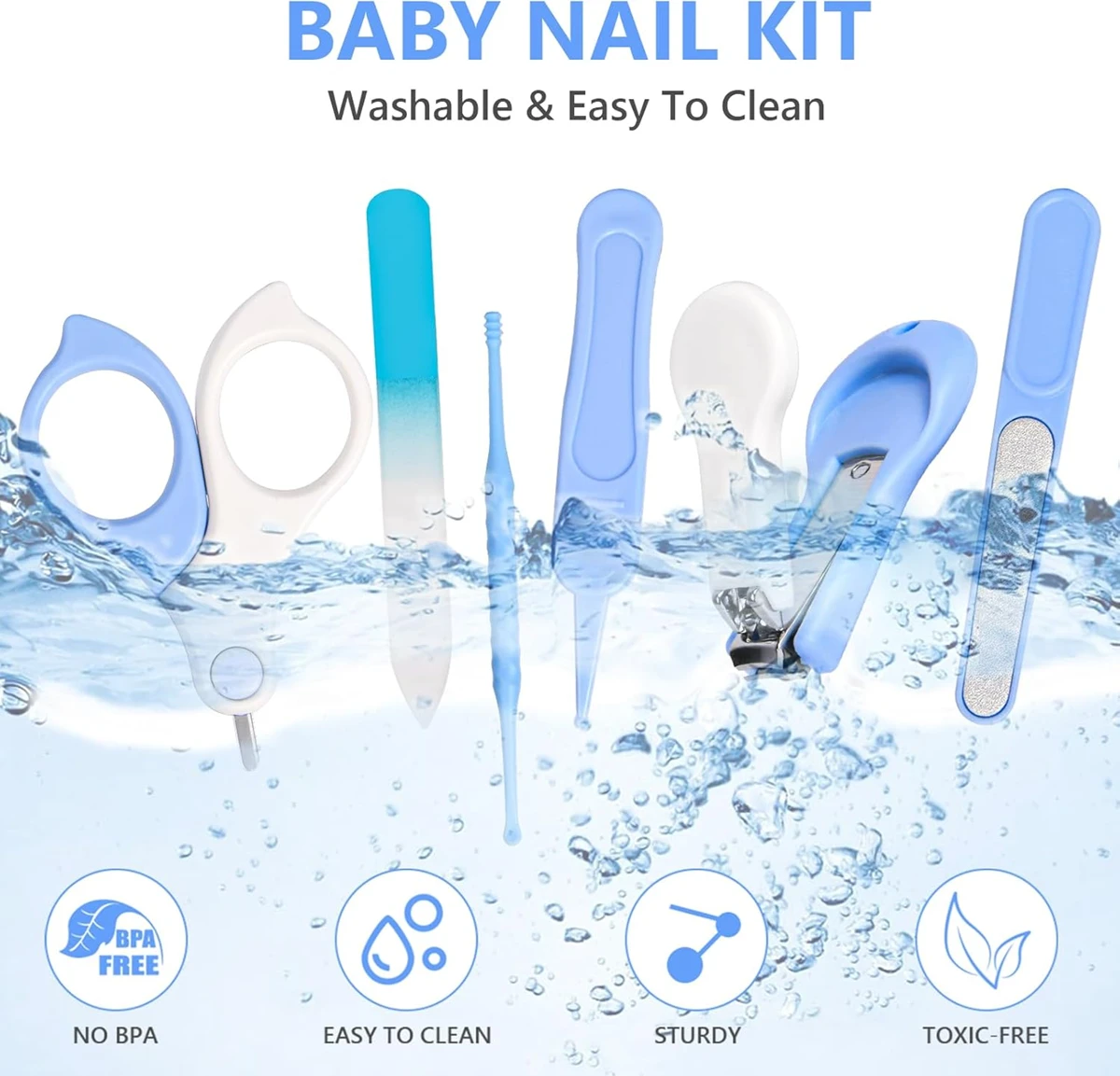Komplettes, sicheres und handliches Maniküre-Set für Babys. Abgerundete Spitzen, ergonomische Griffe und hochwertige Materialien ermöglichen ein schnelles und sanftes Pflegen der kleinen Nägel – ohne Kratzgefahr.