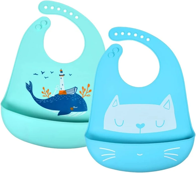 2 × Silikon-Lätzchen mit verstellbarem Verschluss (6-stufige Einstellung) und tiefer Tasche.