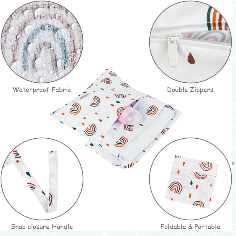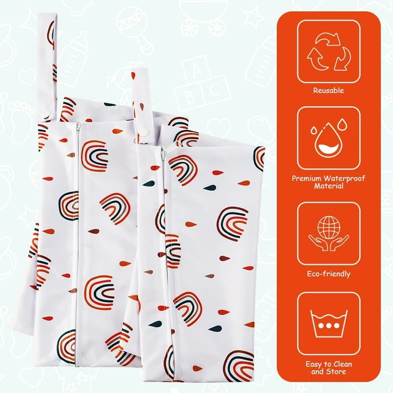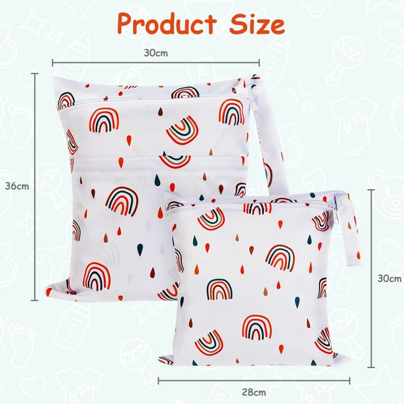 - 2 × Wet & Dry Bag:Groß: ca. 36 × 30 cm, 2 Reißverschlüsse und 2 Fächer — fasst ca. 8–10 Windeln.Klein: ca. 30 × 28 cm, 1 Reißverschluss und 1 Fach — fasst ca. 5–7 Stoffwindeln.
