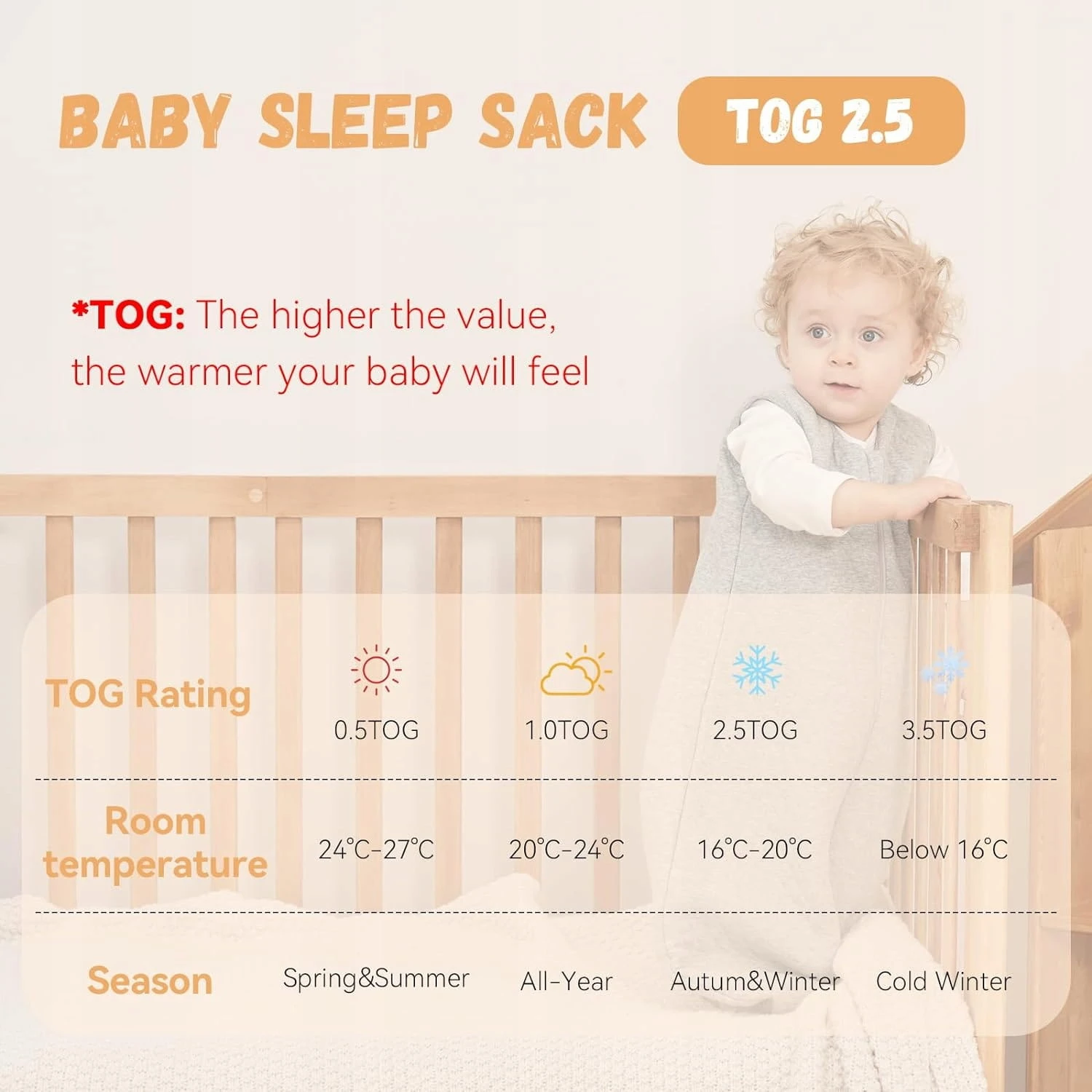 - 【Babyschlafsack 2.5 Tog】 Bereiten Sie Ihr Kind auf kalte Winternächte mit unserem 2.5 TOG Neugeborenen-Schlafsack vor. Speziell für Standard-Raumtemperaturen von 16-20°C entwickelt, bietet er optimale Wärme und Gemütlichkeit. Mit vier verfügbaren Größen – 0-6 Monate, 6-12 Monate, 12-18 Monate und 18-24 Monate – können Sie die passende Passform für das Alter Ihres Kindes wählen und einen bequemen Schlaf gewährleisten.